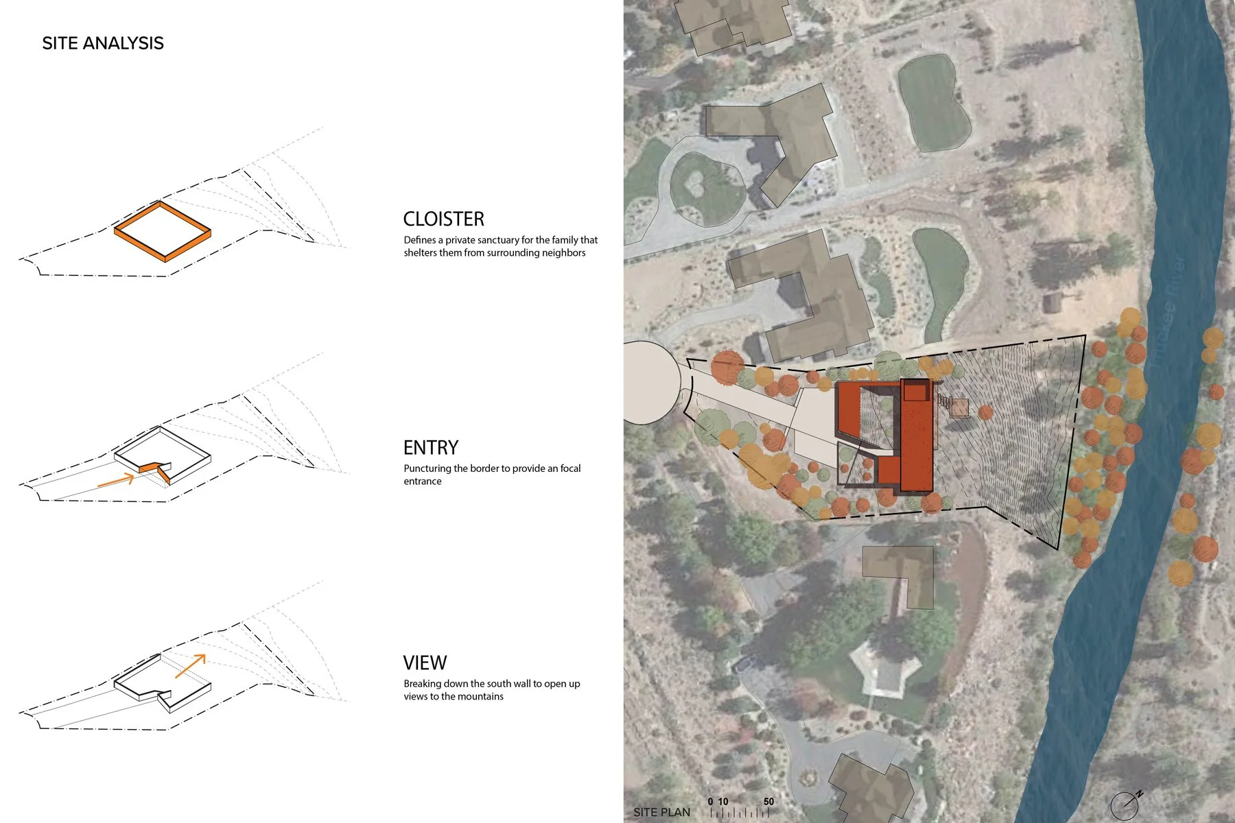 The idea is elemental: an inner world held within stone walls, evoking the tradition of a cloister. These walls define a controlled point of entry and frame a sequence of composed views, allowing the outside world to be experienced only by intention.
