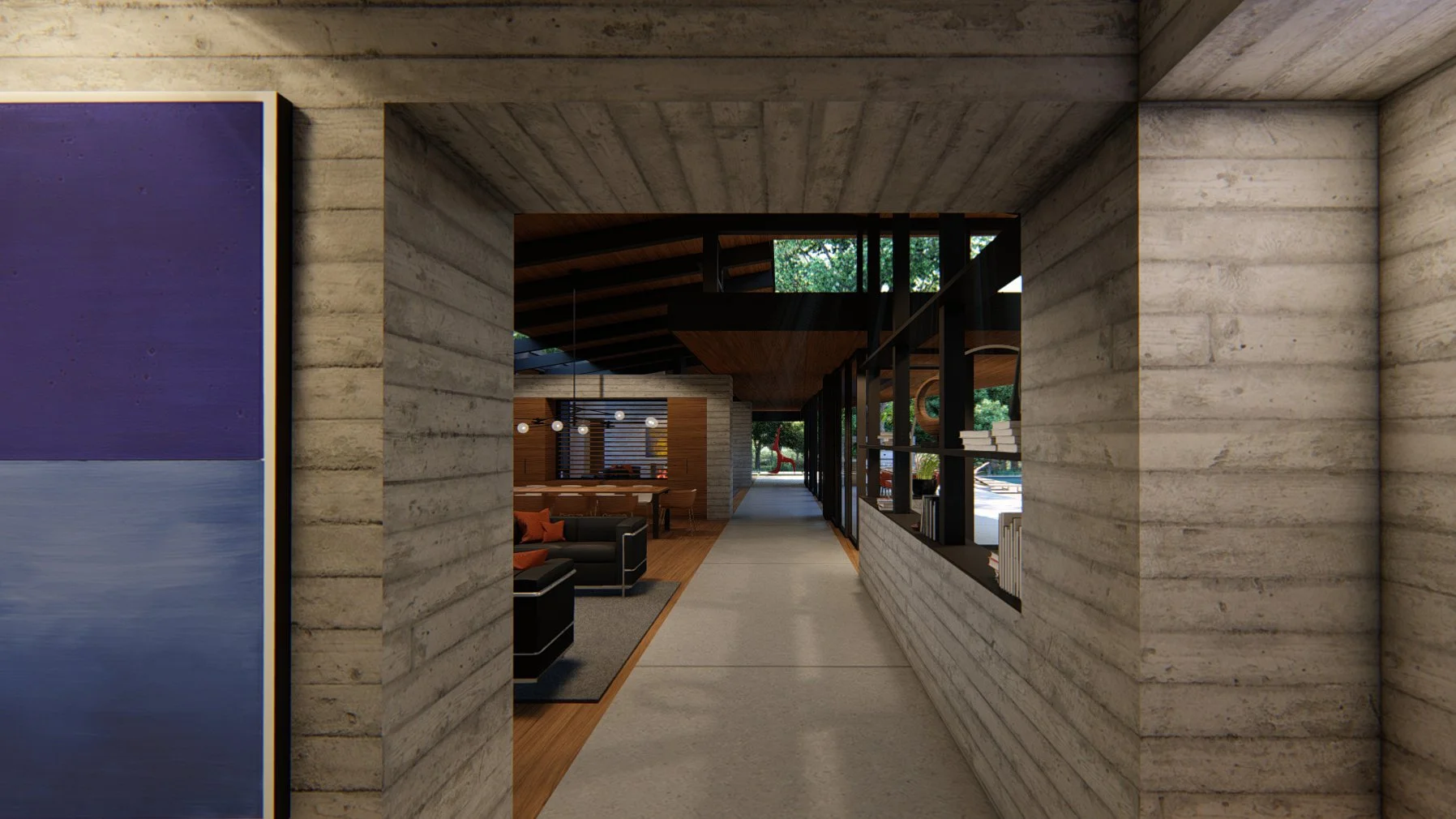 At the crest of the clearing a one-story family wing orients east to west, inviting the dappled morning sun into the guest suite, garden, library and kitchen as the family wakes to start their day.